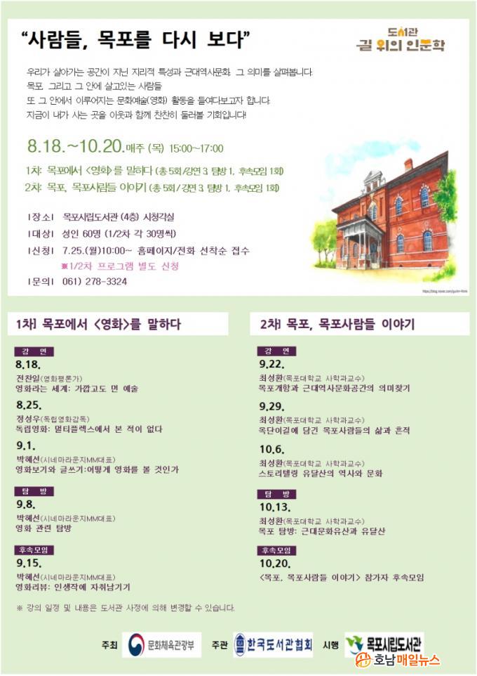 ¸ñÆ÷½Ã¸³µµ¼°üÀº ¡®»ç¶÷µé, ¸ñÆ÷¸¦ ´Ù½Ã º¸´Ù¡¯¶ó´Â Á¦¸ñÀ¸·Î ¡®¸ñÆ÷, ¸ñÆ÷»ç¶÷µé À̾߱⡯, ¡®¸ñÆ÷¿¡¼ ¿µÈ¸¦ ¸»ÇÏ´Ù¡¯¶ó´Â µÎ °¡Áö ÁÖÁ¦ÀÇ ÇÁ·Î±×·¥À» ¿À´Â 8¿ù 18ÀϺÎÅÍ 10¿ù 20ÀϱîÁö ¿î¿µÇϴµ¥ ÁÖÁ¦º°·Î °¢°¢ 3Â÷·Ê¾¿ÀÇ °¿¬°ú ޹æ(1ȸ), ÈļӸðÀÓ(1ȸ)À» ÁøÇàÇÑ´Ù.