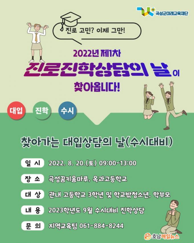 Á¦1Â÷ ÁøÇлó´ãÀº ¡®Ã£¾Æ°¡´Â ´ëÀÔ»ó´ãÀÇ ³¯(¼ö½Ã´ëºñ)¡¯·Î 2023Çг⵵ 9¿ù ¼ö½Ã¿ø¼ Á¢¼ö ´ëºñ¸¦ À§ÇØ °î¼º °ü³» °íµîÇб³ 3ÇÐ³â ¹× Çб³ ¹Û û¼Ò³â, Çкθ𸦠´ë»óÀ¸·Î 9:00 ~ 13:00±îÁö ÁøÇàµÇ¸ç, »ó´ã½ÅûÀº °¢ ÇØ´ç °íµîÇб³¿Í °î¼º±ºÇб³¹Ûû¼Ò³âÁö¿ø¼¾ÅÍ¿¡¼ 7¿ù 27ÀϱîÁö ½ÅûÀ» ¹Þ´Â´Ù.