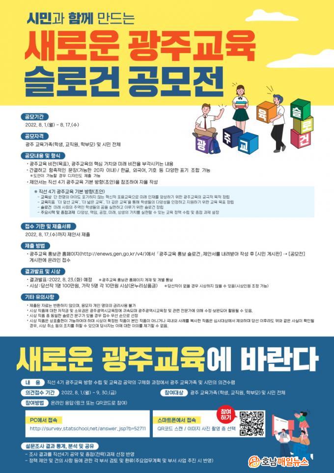 26ÀÏ ±¤Áֽñ³À°Ã»¿¡ µû¸£¸é Á÷¼± 4±â »õ·Î¿î ±¤ÁÖ±³À° ºñÀü°ú °¡Ä¡¸¦ Ç¥ÇöÇÒ ¼ö ÀÖ´Â Âü½ÅÇÑ ±¤ÁÖ±³À° ½½·Î°Ç °³¹ßÀ» À§ÇØ Çлý․Çкθð․±³Á÷¿ø ¹× ±¤ÁֽùÎÀ» ´ë»óÀ¸·Î °ø¸ðÀüÀ» ÃßÁøÇÑ´Ù. ƯÈ÷ À̹ø °ø¸ð¸¦ ÅëÇØ ±¤ÁÖ±³À° Ư»ö°ú Á¤Ã¼¼ºÀ» °¡Àå Àß µå·¯³»´Â ½½·Î°ÇÀ» ¼±Á¤ÇÏ°í ±¤ÁÖ±³À° Á¤Ã¥ È«º¸ µî¿¡ ³Î¸® Ȱ¿ëÇÒ °èȹÀÌ´Ù. °ø¸ð ±â°£Àº ¿À´Â 8¿ù1~17ÀÏÀ̸ç, ±¤ÁÖ±³À° È«º¸°ü ȨÆäÀÌÁö(http://enews.gen.go.kr/v4/)¸¦ ÅëÇØ ¿Â¶óÀÎÀ¸·Î Á¢¼öÇÏ¸é µÈ´Ù.