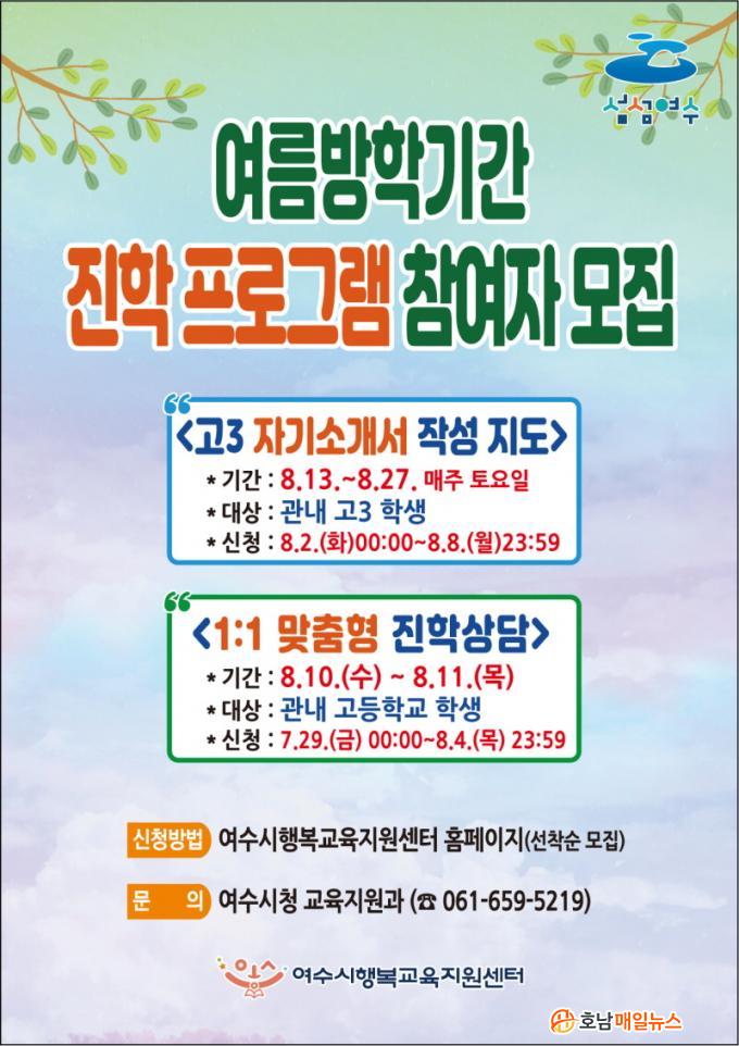 µÎ °úÁ¤ ¸ðµÎ ¿©¼ö½ÃÇູ±³À°Áö¿ø¼¾ÅÍ »ó´ã½Ç¿¡¼ ÁøÇàµÉ ¿¹Á¤ÀÌ´Ù. ¡®ÀÚ±â¼Ò°³¼ ÀÛ¼º °úÁ¤(40¸í)¡¯Àº 8¿ù 2ÀϺÎÅÍ 8¿ù 8ÀϱîÁö, ¡®ÁøÇлó´ã(51¸í)¡¯Àº 7¿ù 29ÀϺÎÅÍ 8¿ù 4ÀϱîÁö ¿©¼ö½Ã Çູ±³À°Áö¿ø¼¾ÅÍ
