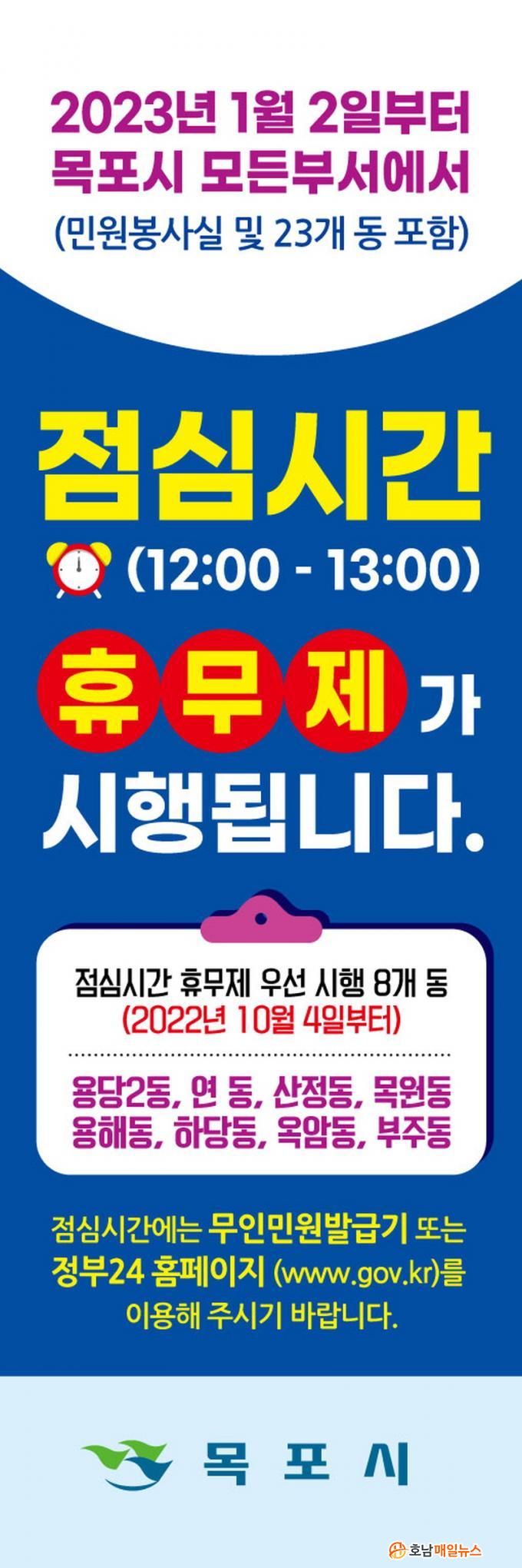 ¸ñÆ÷½Ã´Â ¸ñÆ÷½Ã°ø¹«¿ø³ëµ¿Á¶ÇÕ°úÀÇ ÇùÀÇ¿¡ µû¶ó °ø¹«¿øÀÇ ÈÞ½Ä±Ç º¸ÀåÀ» ÅëÇÑ Ã³¿ì °³¼±°ú ¾çÁúÀÇ ¹Î¿ø¼ºñ½º Á¦°øÀ» À§ÇØ ÀÌ °°ÀÌ °áÁ¤Çß´Ù. Á߽Ľð£ ÈÞ¹«Á¦ ¿î¿µ½Ã°£Àº 12½ÃºÎÅÍ ¿ÀÈÄ 1½Ã±îÁöÀ̸ç, ¸ñÆ÷½Ãû°ú »ç¾÷¼Ò ¹× 23°³ ÇàÁ¤º¹Áö¼¾Å͸¦ Æ÷ÇÔÇÑ ¸ðµç ºÎ¼¿¡¼ ½ÃÇàµÉ ¿¹Á¤ÀÌ´Ù.