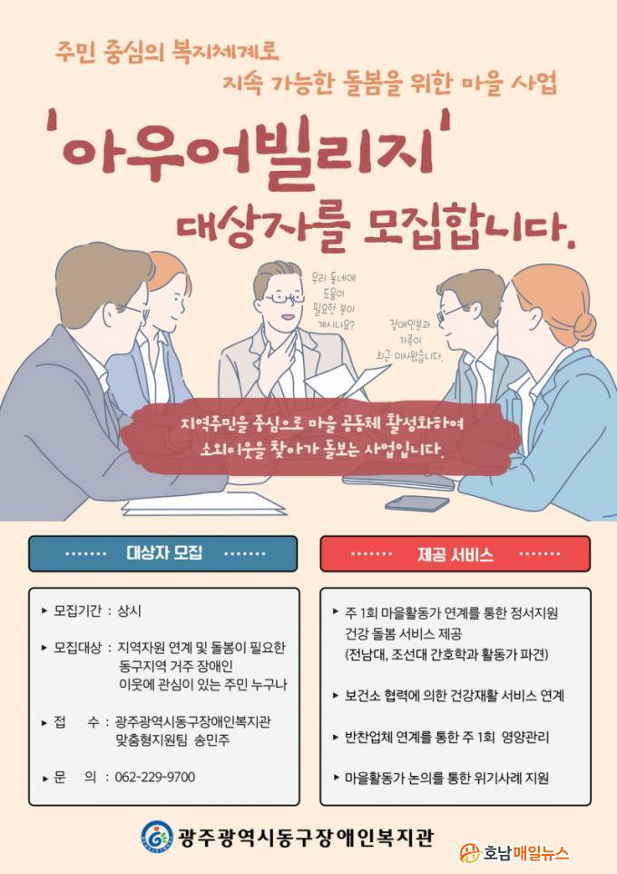¸¶À»È°µ¿°¡ ¸ðÁýÀº »ó½Ã ÁøÇàÇϰí ÀÖÀ¸¸ç, ÀÌ¿ô¿¡ °ü½ÉÀÌ ÀÖ´Â ´©±¸³ª Âü¿©ÇÒ ¼ö ÀÖ´Ù. ¸¶À»È°µ¿°¡¿Í ÇÔ²² ¾Æ¿ì¾îºô¸®ÁöÀÇ µµ¿òÀÌ ÇÊ¿äÇÑ ÀÌ¿ôµµ ¸ðÁýÇϰí ÀÖ´Ù. ´ë»óÀº µ¿±¸ °ü³»¿¡ °ÅÁÖÇÏ´Â Àå¾ÖÀÎÀ̸ç, º»ÀÎÀÌ Á÷Á¢ ½ÅûÇϰųª ÁÖº¯¿¡ µ¹º½°ú Áö¿ª»çȸÀÇ ¿¬°è°¡ ÇÊ¿äÇÑ ÀÌ¿ôÀ» ÃßõÇÒ ¼ö ÀÖ´Ù.