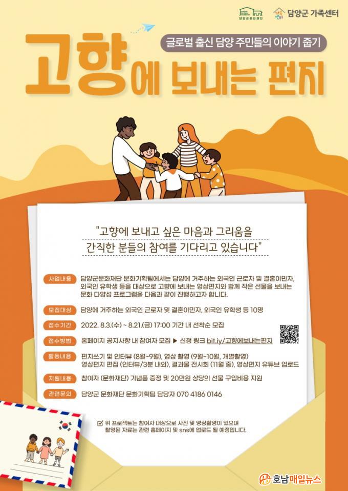 ¡®°íÇâ¿¡ º¸³»´Â ÆíÁö¡¯ ÇÁ·ÎÁ§Æ®´Â 8¿ù 21ÀÏ ÀÏ¿äÀϱîÁö ¿Â¶óÀÎ ±¸±Û Æû ½Åû¼(bit.ly/°íÇâ¿¡º¸³»´ÂÆíÁö)¸¦ ÅëÇØ ½ÅûÇÒ ¼ö ÀÖ´Ù. ÀÚ¼¼ÇÑ »çÇ×Àº ´ã¾ç±º¹®ÈÀç´Ü ¹®È±âȹÆÀ(070-4186-0146)À¸·Î ¹®ÀÇÇϰųª ¹®ÈÀç´Ü ´©¸®Áý(http://www.damyangcf.or.kr)¸¦ ÂüÁ¶ÇÏ¸é µÈ´Ù.