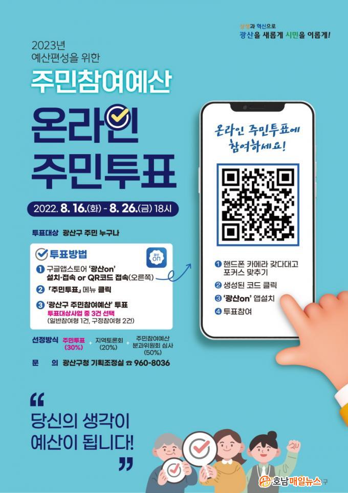 ¿Â¶óÀÎ ÁÖ¹ÎÅõÇ¥´Â ÃÖÁ¾ ½É»ç¸¦ Åë°úÇÑ 18°Ç Áß ³»³â ÁÖ¹ÎÂü¿©¿¹»ê¿¡ ¹Ý¿µÇÒ »ç¾÷À» ¼±Á¤Çϱâ À§ÇÑ °ÍÀ¸·Î, 26ÀϱîÁö ¸ð¹ÙÀÏ ½Ã¹ÎÂü¿©Ç÷§Æû ¡®±¤»êon¡¯¿¡¼ ÁøÇàÇÑ´Ù. ±¤»ê½Ã¹Î ´©±¸³ª Âü¿©ÇÒ ¼ö ÀÖÀ¸¸ç, Àüü ¾È°Ç Áß 3°Ç(ÀϹÝÂü¿©Çü 1°Ç, ±¸Á¤Âü¿©Çü 2°Ç)À» ¼±ÅÃÇÒ ¼ö ÀÖ´Ù.