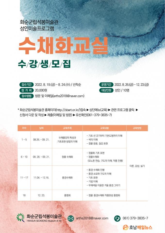 ¼ö¾÷Àº ÀÌ´Þ 26ÀϺÎÅÍ 12¿ù 23ÀϱîÁö ¸ÅÁÖ ±Ý¿äÀÏ(¿ÀÀü 10½Ã~¿ÀÈÄ 1½Ã)¿¡ ¼®ºÀ¹Ì¼ú°ü ±³À°Ã¢À۽ǿ¡¼ ÁøÇàµÈ´Ù.¼öÃ¤È ±×¸®±â ±â¹ý, »öä Ž±¸, ´Ù¾çÇÑ Ç¥Çö ¹æ¹ý µî ¼öÃ¤È À̷аú ½Ç½ÀÀ» º´ÇàÇÒ ¿¹Á¤ÀÌ´Ù.