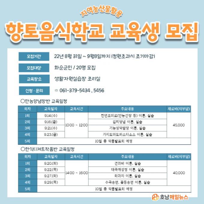 ¸ðÁý°úÁ¤Àº 2°³ °úÁ¤À¸·Î ¸¸´É¾ç³äÀå¹Ý, ÇѽĵðÀúÆ®ÀÛǰ¹ÝÀÌ´Ù. ±³À°Àº 9¿ù 14ÀϺÎÅÍ ¼øÂ÷ÀûÀ¸·Î °³°ÇØ °úÁ¤´ç 4ȸ·Î ÁøÇàµÈ´Ù. ±³À°Àº Á÷Á¢ ¸¸µç ¿ä¸®¸¦ Àü½ÃÇÏ´Â ÀÛǰ¹ßǥȸ(10¿ù ¿¹Á¤)·Î ¸¶¹«¸®ÇÑ´Ù. ±³À°ºñ´Â ¹«·á, Àç·áºñ´Â ÀںδãÀ¸·Î ÁøÇàµÈ´Ù.