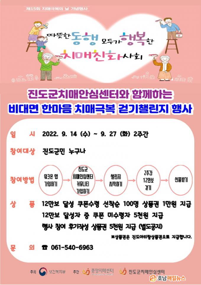 À̹ø Çà»ç´Â ¡®µû¶æÇÑ µ¿Çà ¸ðµÎ°¡ ÇູÇÑ Ä¡¸Å Ä£È »çȸ¡¯¶ó´Â ÁÖÁ¦·Î Ä¡¸Å ¿¹¹æ¿¡ ÁÁÀº °È±â¸¦ ½ÇõÇϱâ À§ÇØ ½Ç½ÃÇÑ´Ù. Áøµµ±º¹Î ´©±¸³ª Âü¿©°¡ °¡´ÉÇϸç, ¸ð¹ÙÀÏ ¾Û ¡®¿öÅ©¿Â¡¯À» ¼³Ä¡ ÈÄ Áøµµ±ºÄ¡¸Å¾È½É¼¾ÅÍ Ä¿¹Â´ÏƼ¿¡ °¡ÀÔ°ú °È±â 縰Áö Âü¿©Çϱ⸦ ´©¸¥ µÚ ÈÞ´ëÀüȸ¦ °¡Áö°í °È±â¸¦ ½ÇõÇÏ¸é µÈ´Ù.