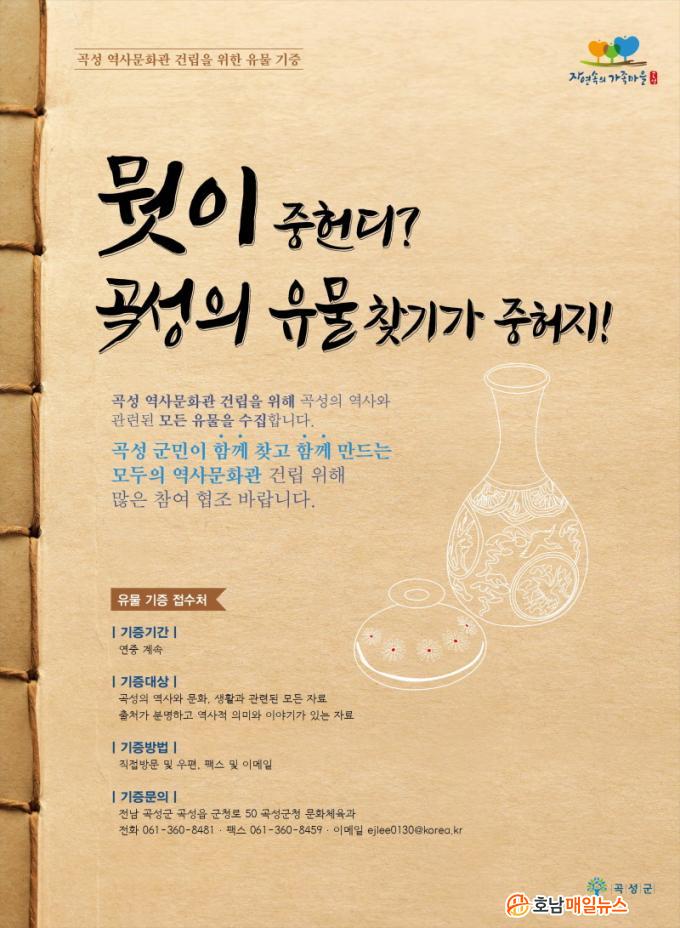 À¯¹° Á¢¼ö ±â°£Àº ±Ý³â 9¿ù 6ÀϺÎÅÍ 12¿ù 31ÀϱîÁö´Ù. ±âÁõÀ» ÇÏ·Á¸é ¸ÕÀú °î¼º±º ¹®ÈüÀ°°ú ¹®ÈÀç°ü¸®ÆÀ¿¡ ±âÁõ ¹× ±âŹ ½Åû¼¸¦ Á¦ÃâÇÏ¸é µÈ´Ù. Á¦Ãâ ¹æ¹ýÀº ¿ìÆí(°î¼º±º °î¼ºÀ¾ ±ºÃ»·Î 50, °î¼º±º ¹®ÈüÀ°°ú) ¶Ç´Â À̸ÞÀÏ(ejlee0130@korea.kr), ÆÑ½º(061-360-8459) Áß ¼±ÅÃÇÒ ¼ö ÀÖ´Ù. ½Åû¼ ¼½ÄÀº °î¼º±º °ø½Ä ȨÆäÀÌÁöÀÇ ¿¸°±ºÁ¤-°í½Ã°ø°í¶õ¿¡¼ ³»·Á¹ÞÀ» ¼ö ÀÖ´Ù.