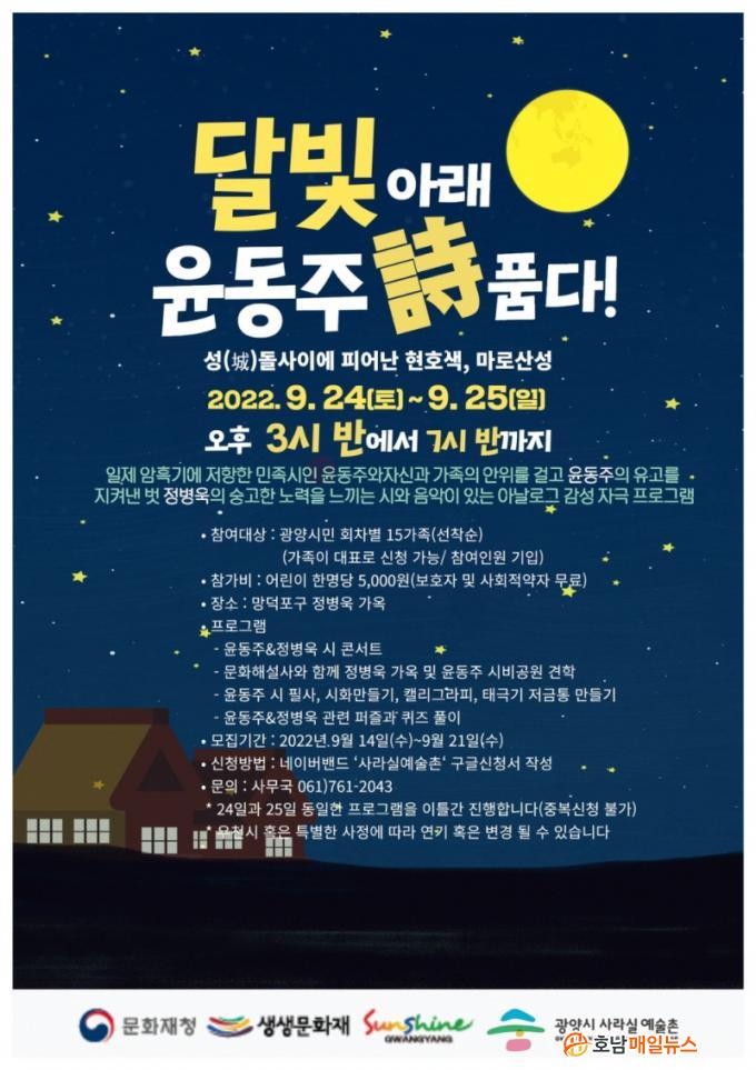 ÇÑÆí, ¡®´Þºû ¾Æ·¡ À±µ¿ÁÖ ãÌ Ç°´Ù¡¯´Â ±¤¾ç½Ã¹ÎÀ» ´ë»óÀ¸·Î 1ÀÏ 15°¡Á·¾¿ ÃÑ 30°¡Á·À» ¼±Âø¼ø ¸ðÁýÇÒ °èȹÀ¸·Î 9¿ù 21ÀϱîÁö Âü°¡ ½ÅûÀ» ¹ÞÀ¸¸ç, ±âŸ ÀÚ¼¼ÇÑ ¹®ÀÇ´Â ±¤¾ç½Ã »ç¶ó½Ç¿¹¼úÃÌ »ç¹«±¹(¢Ï061-761-2043)À¸·Î ÇÏ¸é ¾Ë ¼ö ÀÖ´Ù.