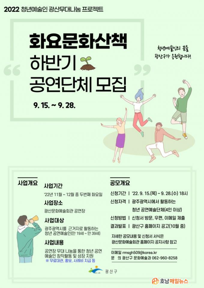 ±¤»ê±¸´Â 2017³â ÆÄÀÏ·µ ÇÁ·Î±×·¥À» ½ÃÀÛÀ¸·Î ¡®È¿ä¹®È»êÃ¥¡¯À» ÅëÇØ Áö±Ý±îÁö ÃÑ 42°³ ´Üü¸¦ Áö¿øÇß´Ù. ¿ÃÇØ´Â ¼ö¿Ï¹®ÈüÀ°¼¾ÅÍ °ø¿¬Àå(312¼® ±Ô¸ð) ¹«´ë±îÁö °ø°£À» È®ÀåÇÏ´Â µî û³â¿¹¼úÀε鿡°Ô ´Ù¾çÇÑ ¹«´ë¸¦ Áö¿øÇϰí ÀÖ´Ù. ¿ÃÇØ ÇϹݱ⠰ø¿¬Àº ±¤»ê¹®È¿¹¼úȸ°ü¿¡¼ 2ȸ ÁøÇàÇÒ ¿¹Á¤ÀÌ´Ù. °ø¸ð ½ÅûÀ» ¹ÞÀº ÈÄ ½É»ç¸¦ °ÅÃÄ 2°³ û³â¿¹¼ú´Üü¸¦ ¼±Á¤ÇÑ´Ù.