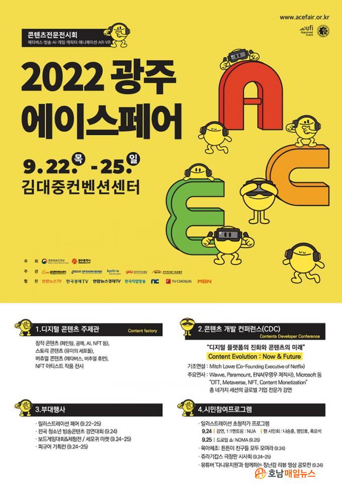 2022 ±¤ÁÖ ¿¡À̽º Æä¾î´Â ±¤ÁÖ±¤¿ª½Ã¿Í ¹®ÈüÀ°°ü±¤ºÎ°¡ ÁÖÃÖÇÏ°í ±è´ëÁßÄÁº¥¼Ç¼¾ÅÍ, ±¤ÁÖÁ¤º¸¹®È»ê¾÷ÁøÈï¿ø, Çѱ¹ÄÉÀ̺íTV¹æ¼ÛÇùȸ, ±¤ÁÖµðÀÚÀÎÁøÈï¿ø, ´ëÇѹ«¿ªÅõÀÚÁøÈï°ø»ç(KOTRA)°¡ ÁÖ°üÇÏ´Â Çà»ç·Î ¿ÃÇØ·Î 17ȸ°¸¦ ¸Â¾Ò´Ù.