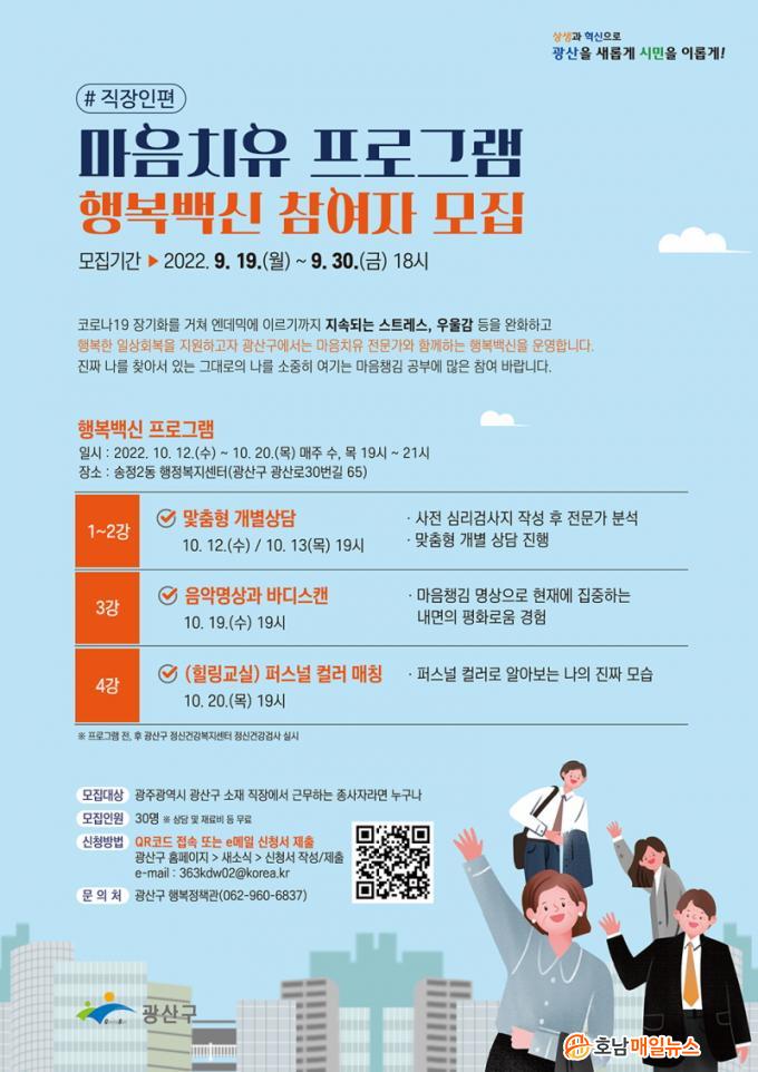 Á÷ÀåÀÎ Æí Çູ¹é½ÅÀº 10¿ù12ÀϺÎÅÍ ¸ÅÁÖ ¼ö, ¸ñ Àú³á 7½Ã ±¤»ê±¸ ¼ÛÁ¤2µ¿ ÇàÁ¤º¹Áö¼¾ÅÍ¿¡¼ ÃÑ 4ȸ ÁøÇàÇÒ ¿¹Á¤ÀÌ´Ù. Âü¿©ÀÚÀÇ »çÀü ¿Â¶óÀÎ ½É¸®°Ë»ç ºÐ¼®°á°ú¸¦ ¹ÙÅÁÀ¸·Î Àü¹® »ó´ã°¡¿Í ÇÔ²² ±íÀÌ ÀÖ´Â ¸ÂÃãÇü °³º° ½É¸®»ó´ãÀ» Á¦°øÇÑ´Ù. ÀÌÈÄ À½¾Ç¸í»ó, ¡®ÆÛ½º³Î Ä÷¯ ¸ÅĪ¡¯ µîµµ ÁøÇàÇÑ´Ù.
