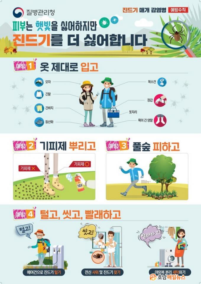 ÂêÂê°¡¹«½ÃÁõ, SFTS(ÁßÁõ¿¼ºÇ÷¼ÒÆÇ°¨¼ÒÁõÈıº) µî Áøµå±â¸Å°³°¨¿°º´À» ¿¹¹æÇϱâ À§Çؼ´Â Áøµå±â¿¡ ¹°¸®Áö ¾Ê´Â °ÍÀÌ Áß¿äÇÏ´Ù. µû¶ó¼ ¾ß¿ÜȰµ¿ ½Ã¿¡´Â ±ä ÆÈ¡¤±ä ¹ÙÁö Âø¿ë µîÀ¸·Î ÇǺΠ³ëÃâÀ» ÃÖ¼ÒÈÇϰí, ±Í°¡ ÈÄ¿¡´Â ¹Ù·Î ¿ÊÀ» ¼¼Å¹Çϰí Áøµå±â¿¡ ¹°·È´ÂÁö È®ÀÎÇØ¾ß ÇÑ´Ù.