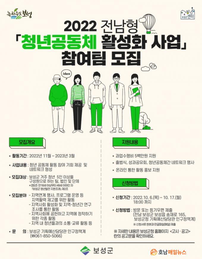 Áö¿ø ÀÚ°ÝÀº º¸¼º±º¿¡ °ÅÁÖÇϰí ÀÖ´Â 5ÀÎ ÀÌ»óÀÇ Ã»³â°øµ¿Ã¼·Î ¸ðÁý ±â°£Àº 2022³â 10¿ù 6ÀϺÎÅÍ 10¿ù 17ÀϱîÁö´Ù. »ç¾÷´ë»óÀÚ·Î ¼±Á¤µÇ¸é ¿À´Â 11¿ùºÎÅÍ ³»³â 3¿ù±îÁö 5°³¿ù°£ Ȱµ¿ÇÏ°Ô µÈ´Ù.