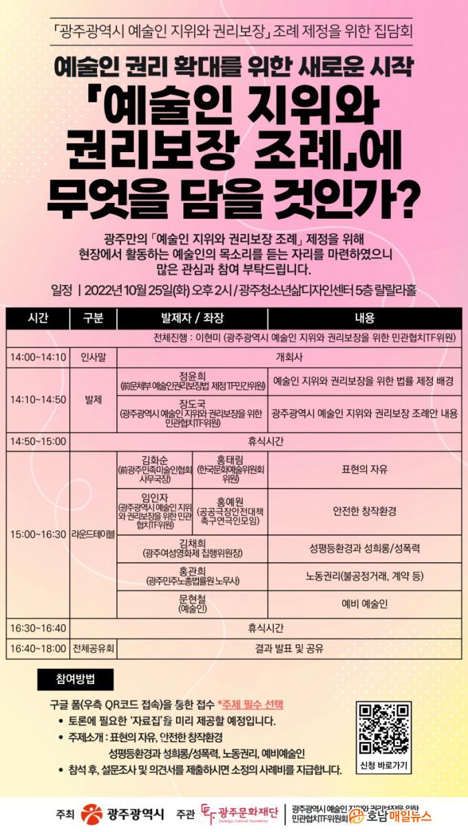 ±¤Áֽð¡ ÁÖÃÖÇÏ°í ±¤ÁÖ¹®ÈÀç´ÜÀÌ ÁÖ°üÇÏ´Â À̹ø Áý´ãȸ´Â ÇöÀå¿¡¼ Ȱµ¿ÇÏ´Â ¿¹¼úÀÎÀÇ ÀǰßÀ» ûÃëÇϰí Áö¿ª ½ÇÁ¤¿¡ ¸Â´Â ½ÇÁúÀûÀÎ ¿¹¼úÀÎ ÁöÀ§¿Í ±Ç¸®º¸Àå Á¤Ã¥ ¹æ¾ÈÀ» ã±â À§ÇØ ¸¶·ÃµÆ´Ù.