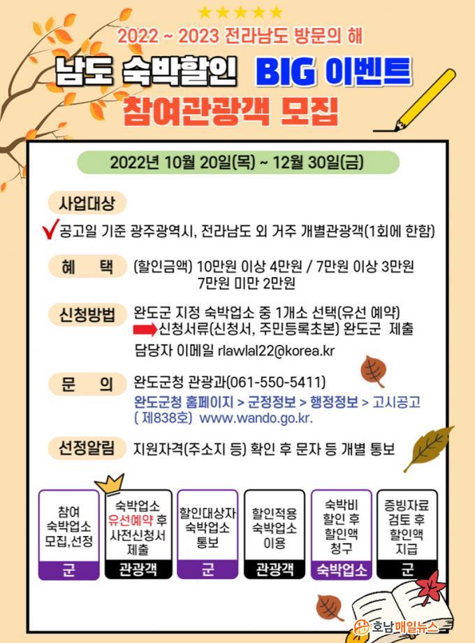 ¡®2022~2023 Àü¶ó³²µµ ¹æ¹®ÀÇ ÇØ¡¯¸¦ ¸Â¾Æ ÁøÇàµÇ´Â À̹ø À̺¥Æ®´Â ¿À´Â 12¿ù 30ÀϱîÁö ¼÷¹Úºñ À̺¥Æ® ½Åû¼¸¦ ±º¿¡ Á¦ÃâÇÑ ÈÄ ÁöÁ¤µÈ ¼÷¹Ú¾÷¼Ò¸¦ ÀÌ¿ëÇÏ¸é ¼÷¹Úºñ ÀϺθ¦ ÇÒÀÎ¹Þ°Ô µÈ´Ù.