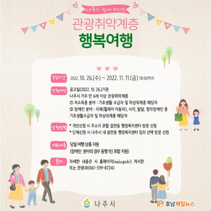 ³ªÁÖ½Ã(½ÃÀå À±º´ÅÂ)´Â ¡®2022³â Àü³² °ü±¤Ãë¾à°èÃþ Çູ¿©ÇàȰµ¿ Áö¿ø »ç¾÷¡¯ Âü°¡ÀÚ ¹× ´Üü¸¦ ¿À´Â 11ÀϱîÁö ¸ðÁýÇÑ´Ù°í 4ÀÏ ¹àÇû´Ù. ÀÌ »ç¾÷Àº Æò¼Ò ¿©ÇàÀ» ´Ù´Ï±â ¾î·Á¿î Àú¼ÒµæÃþ, Àå¾ÖÀÎÀÇ °ü±¤±âº»±Ç º¸Àå°ú µµ³» °ü±¤»ê¾÷ Ȱ¼ºÈ¸¦ À§ÇØ 1Àδç 15¸¸¿ø »ó´çÀÇ ¿©Çà »óǰÀ» Áö¿øÇØÁØ´Ù.