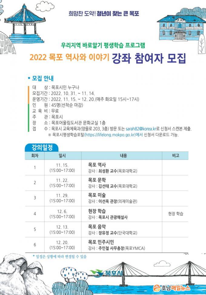 À̹ø °Á´ Áö¿ª Àü¹®°¡µéÀÇ ´Ù¾çÇÑ °ÀǸ¦ ÅëÇØ ¸ñÆ÷ÀÇ ¿ª»ç¿Í ¹®È, ¿¹¼ú µîÀ» ü°èÀûÀ¸·Î ¹è¿ï ¼ö ÀÖ´Â ±³À° ÇÁ·Î±×·¥À¸·Î ¿À´Â 11¿ù 15ÀϺÎÅÍ 12¿ù 20ÀϱîÁö ¸ÅÁÖ È¿äÀÏ ¿ÀÈÄ 3~5½Ã Áö³´Þ °³°üÇÑ ¸ñÆ÷¾î¿ï¸²µµ¼°ü ¹®È±³½Ç(1Ãþ)¿¡¼ 6ȸ(ÀÌ·Ð 5ȸ, ÇöÀåÇнÀ 1ȸ)¿¡ °ÉÃÄ ¹«·á·Î ÁøÇàµÈ´Ù.