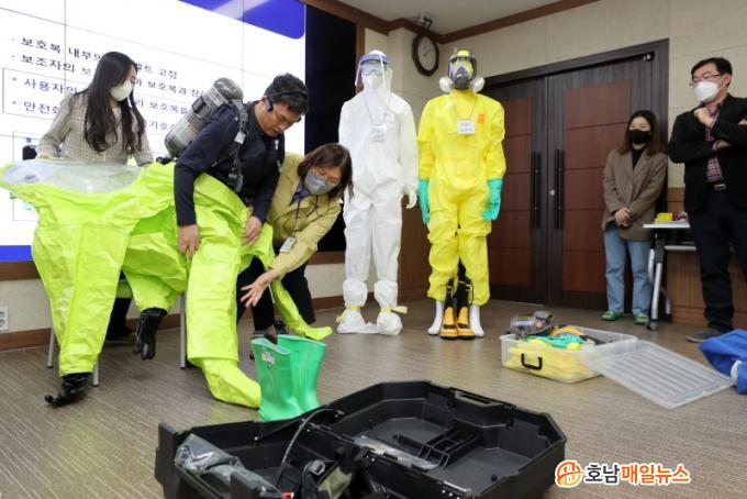À̹ø ÈÆ·ÃÀº Äڷγª19 Àå±âÀ¯ÇàÀ¸·Î ÀÎÇØ 2³â ¸¸¿¡ ½Ç½ÀÇü ÈÆ·Ã¹æ½ÄÀ¸·Î ÁøÇàµÆ´Ù. ±¤ÁÖ½Ã, ½Ã °¨¿°º´°ü¸®Áö¿ø´Ü, ±¤»ê¼Ò¹æ¼, ±¤»ê±¸º¸°Ç¼Ò, Çϳ²¼º½Éº´¿ø, KSº´¿ø µî 35¸íÀÌ Âü¿©ÇØ »ý¹°Å×·¯ ´ëºñ¡¤´ëÀÀü°è, °³Àκ¸È£º¹(Level A, C) Âø‧Å»ÀÇ, ´ÙÁߎÁöŰƮ °Ë»ç ½ÃÇà ¹æ¹ý ¹× °Ëü Æ÷Àå ¹æ¹ý µîÀ» ¼÷ÁöÇß´Ù.