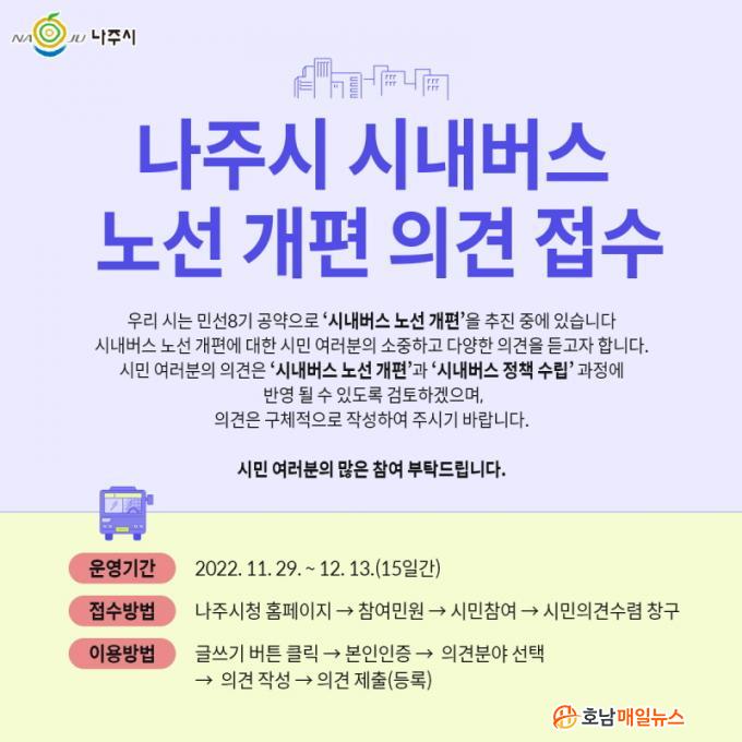 ³ªÁÖ½Ã(½ÃÀå À±º´ÅÂ)´Â 11¿ù 29ÀϺÎÅÍ 12¿ù 13ÀϱîÁö º¸¸§ °£ ½Ãû ´©¸®ÁýÀ» ÅëÇØ ¡®¹Î¼± 8±â ½Ã³»¹ö½º ³ë¼± °³Æí¡¯ °ü·Ã ½Ã¹Î ÀǰßÀ» Á¢¼öÇÑ´Ù°í 28ÀÏ ¹àÇû´Ù.