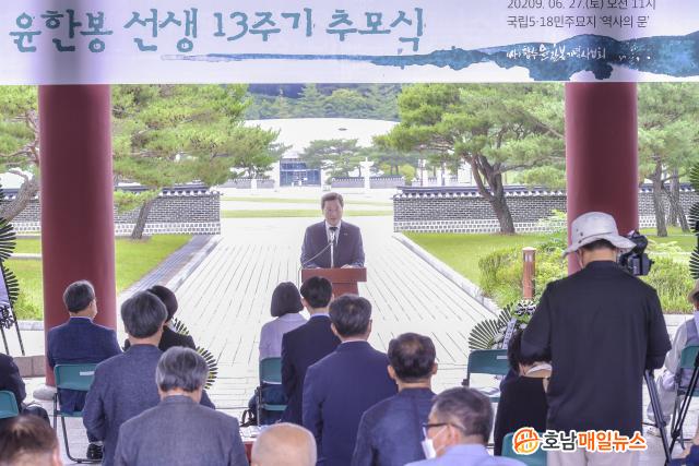 ÇÑÆí, À̿뼷 ±¤ÁÖ±¤¿ª½ÃÀåÀÌ 27ÀÏ ¿ÀÈÄ ºÏ±¸ ¿îÁ¤µ¿ ±¹¸³ 5⋅18¹ÎÁÖ¹¦Áö ¿ª»çÀÇ ¹®¿¡¼ ¿¸° ͺ ÇÕ¼ö À±ÇѺÀ ¼±»ý 13ÁÖ±â Ã߸ð½Ä¿¡ Âü¼®ÇØ "Æò»ýÀ» ¼Ò¿ÜµÈ À̵éÀÇ ¹þÀÌÀÚ Çѱ¹¹ÎÁÖÈÀÇ °Å¸§À¸·Î »ì°íÀÚ Çß´ø À±ÇѺÀ ¼±»ý´ÔÀÇ »îÀº ¿À´ÃÀ» »ç´Â ¿ì¸®¿¡°Ô Å« ±³ÈÆÀ» ÁÖ°í ÀÖ´Ù¸ç, ÇÑ Æò»ý ¹ÎÁÖÁÖÀÇ¿Í ÀαÇÀ» À§ÇØ ¸öÀ» ¹ÙÄ¡¼Ì´ø ¼±»ý´ÔÀÇ °í±ÍÇÑ ¶æ°ú Ä¡¿ÇÑ È°µ¿ °è½Â¿¡ ±¤Áֽð¡ ¾ÕÀå¼°Ú´Ù"°í ¸»Çß´Ù.