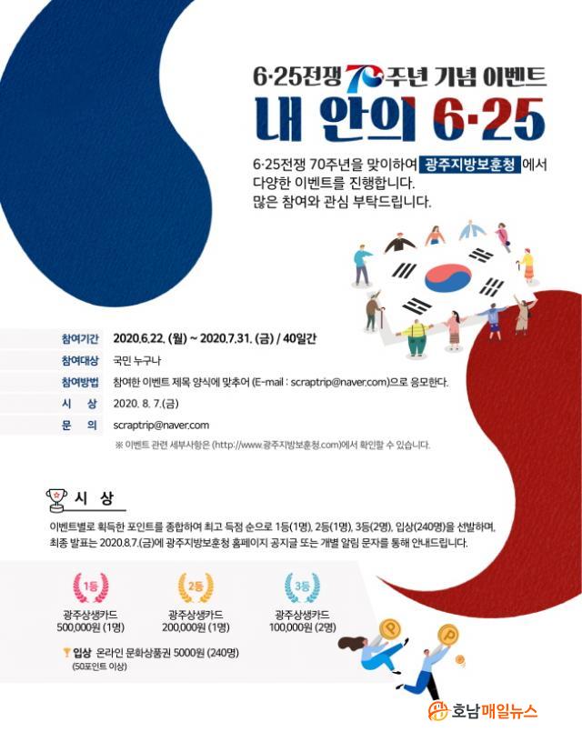 À̹ø <³» ¾ÈÀÇ 6¡¤25> À̺¥Æ®´Â 6¡¤25ÀüÀïÀ» Å׸¶·Î ÇÑ 6°³ÀÇ À̺¥Æ®¸¦ µ¿½Ã¿¡ ÁøÇàÇÏ´Â ÅëÇÕÇü ¿Â¶óÀÎ Çà»ç·Î ÁøÇàµÇ¸ç, 1µîºÎÅÍ 3µî¿¡°Ô´Â ±¤ÁÖ »ó»ýÄ«µå °¢°¢ 50¸¸¿ø, 20¸¸¿ø, 10¸¸¿øÀ» Áö±ÞÇÏ´Â µî ¿ì¼ö ÀÀ¸ðÀÚ¸¦ ´ë»óÀ¸·Î ÃÑ 210¸¸¿ø »ó´çÀÇ »ó±ÝÀ» Áö±ÞÇÒ ¿¹Á¤ÀÌ´Ù.