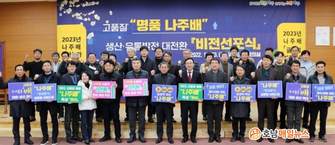 ³ªÁֽô ¡®2023³â ³ªÁÖ¹è ±Û·Î¹ú ºê·£µåÈ ¿ø³â¡¯À» ¸ñÇ¥·Î 5°³ ºñÀüÀ» ¼±Æ÷ÇÏ´Â ÇÑÆí °íǰÁú ³ªÁÖ¹è ºê·£µå À°¼ºÀ» À§ÇÑ »ý»ê¡¤À¯ÅëÁ¶Á÷°úÀÇ °øµ¿ Çù·ÂÀ» ´ÙÁüÇß´Ù. ºñÀü ¼±Æ÷½Ä¿¡´Â À±º´Å ³ªÁÖ½ÃÀå, ÀÌ»ó¸¸ ½ÃÀÇȸÀÇÀå, ±èÈ£Áø¡¤ÀÌÀçÅ¡¤ÃÖ¸í¼ö µµÀÇ¿ø°ú ½ÃÀÇ¿ø, ³ªÁÖ¹è »ý»ê¡¤À¯ÅëÁ¶Á÷, ¼öÃâ¾÷ü ´ëÇ¥¡¤°ü°èÀÚ µî 50¿©¸íÀÌ Âü¼®Çß´Ù.