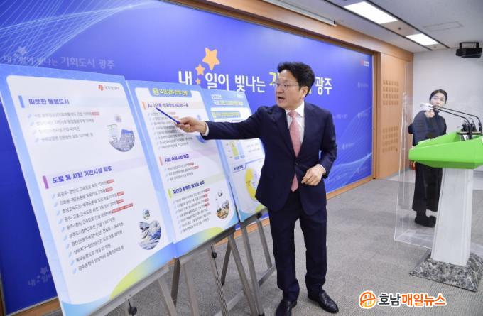 °±âÁ¤ ±¤ÁÖ½ÃÀåÀº ¡°2023³â ±¤ÁÖ´Â ³»ÀÏÀ» ÁÖµµÇÏ´Â ½Å°æÁ¦µµ½Ã, Àç¹Ì¿Í Ȱ·ÂÀÌ ³ÑÄ¡´Â µµ½Ã, µû¶æÇϰí ÃÎÃÎÇÑ µ¹º½µµ½Ã, ¾ðÁ¦ ¾îµð¼³ª ¾È½Éµµ½Ã, ¸ðµÎ°¡ ¼ºÀåÇÏ´Â ±³À°µµ½Ã µî »õ·Î¿î ±¤ÁÖ·ÎÀÇ µµ¾àÀ» ½ÃÀÛÇÏ´Â ½Ã±â¡±¶ó¸ç ¡°½Ã±ÞÈ÷ ÃßÁøÇØ¾ß ÇÒ Çö¾È»ç¾÷µéÀÌ Á¤ºÎ¿¹»ê¿¡ ¹Ý¿µµÈ ¸¸Å ³»¡ÙÀÏÀÌ ºû³ª´Â ±âȸµµ½Ã ±¤ÁÖ¸¦ ¸¸µå´Âµ¥ ¿ÂÈûÀ» ½ñ¾Æ ´Þ¶ó¡±°í ÁÖ¹®Çß´Ù.