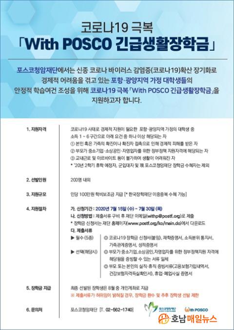 ¡¸With POSCO ±ä±Þ»ýȰÀåÇбݡ¹ ¼±¹ß´ë»óÀº ¿ÃÇØ ±âÁØÁßÀ§¼Òµæ 60% ÀÌÇÏÀÎ Æ÷Çס¤±¤¾çÁö¿ª °¡Á¤ÀÇ ´ëÇлýÀ¸·Î, Äڷγª19 »çÅ·ΠÀÎÇØ ºÎ¸ð°¡ ½ÇÁ÷À̳ª Æó¾÷À» ´çÇØ °¡Á¤°æÁ¦°¡ ±Þ°ÝÈ÷ ¾î·Á¿öÁ³°Å³ª ¾Æ¸£¹ÙÀÌÆ® ÀÏÀÚ¸®¸¦ ÀÒ¾î »ýȰÀÌ ¾î·Á¿öÁø ÇлýÀÌ´Ù. ¼±¹ßÀοøÀº 200¸í ±Ô¸ðÀÌ¸ç ±Ý¹ø ¼±¹ßµÈ ÇлýµéÀº Àδç 100¸¸¿øÀÇ Çкñº¸Á¶±ÝÀ» 8¿ù Áß Áö±Þ¹Þ°Ô µÈ´Ù.