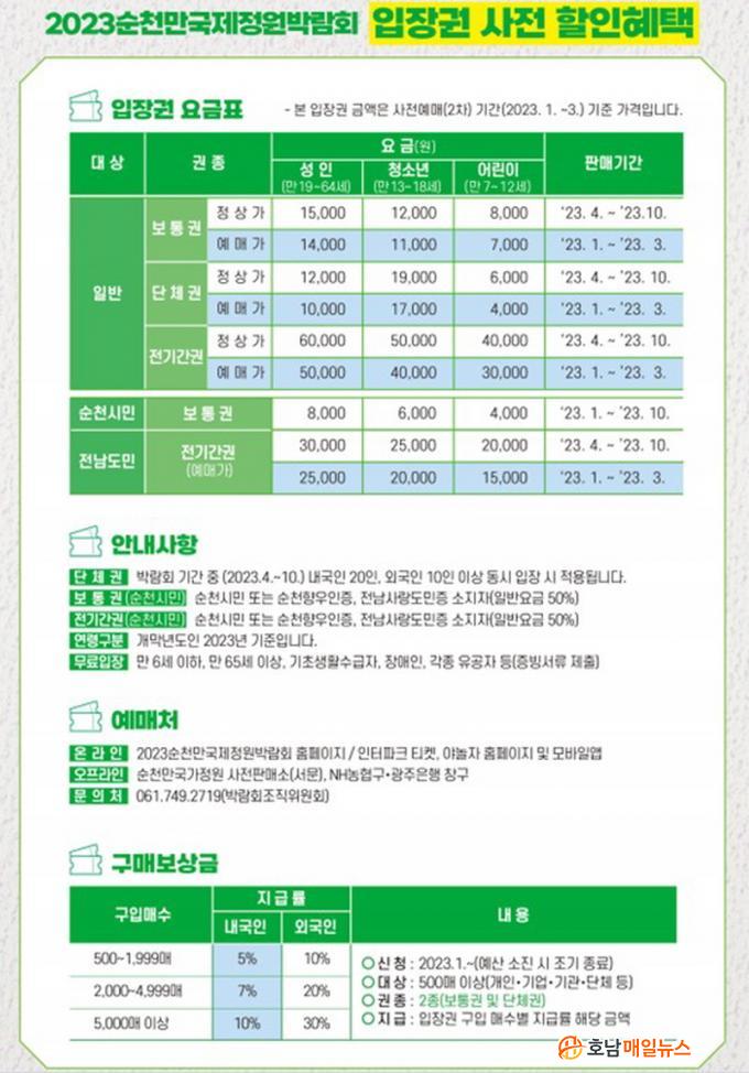 2023¼øÃµ¸¸±¹Á¦Á¤¿ø¹Ú¶÷ȸ ¿¹¸Å ÀÔÀå±ÇÀº ¹Ú¶÷ȸ ´çÀÏ ÀÔÀåÀÌ °¡´ÉÇÑ ¡®º¸Åë±Ç¡¯°ú Àü ±â°£ ÀÚÀ¯ ÀÔÀåÀÌ °¡´ÉÇÑ ¡®Àü±â°£±Ç¡¯ÀÌ ÀÖ´Ù. ÇÒÀÎ ÇýÅÃÀÌ Àû¿ëµÈ º¸Åë±ÇÀº Á¤»ó°¡¿¡¼ 1õ¿øÀ» ÇÒÀÎÇØ ¼ºÀÎ 1¸¸ 4õ¿ø, û¼Ò³â 1¸¸ 1õ¿ø, ¾î¸°ÀÌ 7õ¿ø¿¡ ÆÇ¸ÅÇÑ´Ù. ¼øÃµ½Ã¹ÎÀÇ °æ¿ì ¿ì´ë¿ä±ÝÀ» Àû¿ëÇØ ¼ºÀÎ 8õ¿ø, û¼Ò³â 6õ¿ø, ¾î¸°ÀÌ 4õ¿ø¿¡ º¸Åë±ÇÀ» ±¸¸ÅÇÒ ¼ö ÀÖ´Ù.