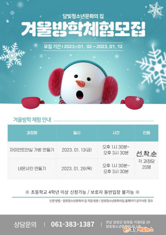 ÃʵîÇб³ 4Çгâ ÀÌ»ó û¼Ò³âÀ» ´ë»óÀ¸·Î ÇÁ·Î±×·¥´ç °¢ 20¸í¾¿ ¸ðÁýÇϸç, Âü¿©´Â 1¿ù 12ÀϱîÁö ´©¸®Áý(http://www.damyang.go.kr/youth) °øÁö»çÇ׿¡¼ üÇè ³»¿ëÀ» Âü°íÇØ ´ãºûû¼Ò³â¹®ÈÀÇÁý¿¡ Á÷Á¢ ¹æ¹®ÇØ ½ÅûÇÏ¸é µÈ´Ù.
