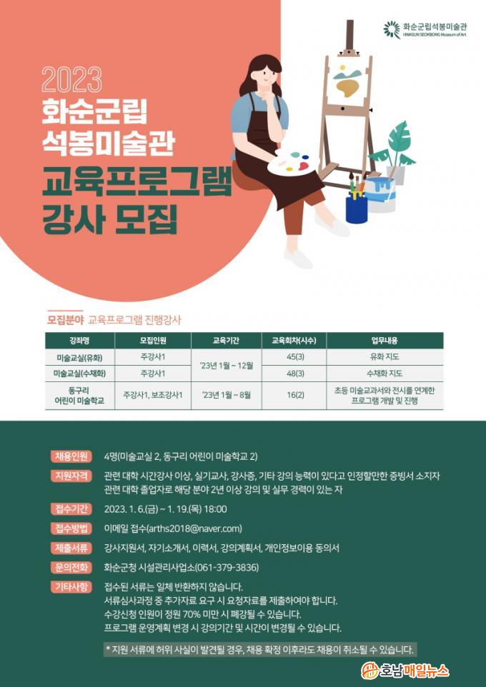 ȼø±º¸³¼®ºÀ¹Ì¼ú°ü¿¡¼´Â µÎ ÇÁ·Î±×·¥À» À̲ø¾î ³ª¾Æ°¥ Àü¹®¼ºÀ» °¡Áø °»ç¸¦ ä¿ëÇϰíÀÚ ÇÑ´Ù. ä¿ëÀοøÀº ¡®¹Ì¼ú±³½Ç¡¯ À¯È¹Ý ÁÖ°»ç 1¸í, ¼öÃ¤È¹Ý ÁÖ°»ç 1¸í, ¡®µ¿±¸¸® ¾î¸°ÀÌ ¹Ì¼úÇб³¡¯ 2¸í(ÁÖ°»ç 1¸í, º¸Á¶°»ç 1¸í)À¸·Î ÃÑ 4¸íÀ» ä¿ëÇϸç, Áö¿ø ÀÚ°ÝÀº ´ëÇÐ ½Ã°£°»ç ÀÌ»ó µî °ÀÇ ´É·ÂÀÌ ÀÎÁ¤µÇ´Â Áõºù¼ ¼ÒÁöÀÚ, °ü·Ã ´ëÇÐ Á¹¾÷ÀÚ·Î ÇØ´ç ºÐ¾ß 2³â ÀÌ»ó °ÀÇ ¹× ½Ç¹« °æ·ÂÀÌ ÀÖ´Â ÀÚÀÌ´Ù.