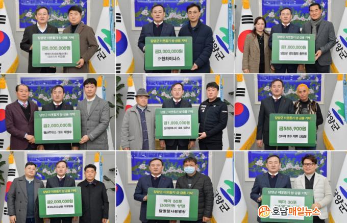 ´ã¾ç±º¿¡ µû¸£¸é ¿£¿¡ÀÌÄ¡³×Æ®¿÷½º(ÁÖ) À̱ٽŠ´ëÇ¥À̻簡 500¸¸¿øÀ» ±âŹÇßÀ¸¸ç, (ÁÖ)õÇÏÀ̳ʽº(´ëÇ¥ ±èÇÐ) 300¸¸¿ø, ±Ý¼º³ëÀοä¾ç¿ø Á÷¿ø Àϵ¿ 200¸¸¿ø, ´ã¾ç±º±ÃµµÇùȸ Ãѹ«Á¤ 100¸¸¿ø, ¿ù»êÁÖÀ¯¼Ò ¹èÁ¤¼ö ´ëÇ¥ 200¸¸¿ø, ºû°¡¶÷ ¿¡³ÊÁö ±èÂù¶õ ´ëÇ¥ 100¸¸¿ø, »ê¾Æ·¡È£¼ö ½Å¼º¿ø ´ëÇ¥°¡ 58¸¸¿øÀ» ±âŹÇß´Ù.