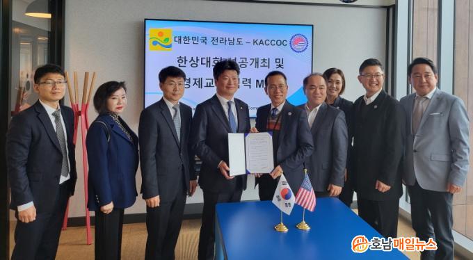 ¾÷¹«Çù¾à½Ä¿¡¼ ¹Úâȯ Àü³²µµ Á¤¹«ºÎÁö»ç´Â ¡°Áö³ 2019³â Á¦18Â÷ ¼¼°èÇÑ»ó´ëȸ°¡ Àü³²¿¡¼ ¿·Á 2¾ï ´Þ·¯ÀÇ ºñÁî´Ï½º ¼º°ú»Ó¸¸ ¾Æ´Ï¶ó, 3¸¸¿© °ü¶÷°´ÀÌ ´Ù³à°¡´Â µî Áö¿ª°æÁ¦ Ȱ¼ºÈ¿¡ Å©°Ô ±â¿©Çß´Ù¡±¸ç ¡°À̹ø ¾÷¹«Çù¾àÀ¸·Î ¼¼°è ºñÁî´Ï½º Á᫐ ¹«´ëÀÎ ¹Ì±¹¿¡ µçµçÇÑ ÆÄÆ®³Ê¸¦ È®º¸ÇÑ ¸¸Å ¿©·¯ ºÐ¾ß¿¡¼ »óÈ£ ±³·ù¿Í Çù·ÂÀ» È®´ëÇϰڴ١±°í ¸»Çß´Ù.