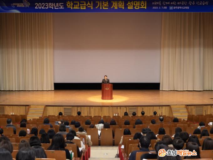 7ÀÏ ½Ã±³À°Ã»¿¡ µû¸£¸é À̳¯ 2023Çг⵵ Çб³±Þ½Ä ±âº»°èȹ ¼³¸íȸ¸¦ °³ÃÖÇß´Ù. ¼³¸íȸ´Â ±¤ÁÖ Çб³±Þ½ÄÀÇ ÁÖ¿ä Á¤Ã¥¹æÇâ°ú ¾ÈÀüÇÏ°í °Ç°ÇÑ Çб³±Þ½Ä ¿î¿µÀ» À§ÇØ ¾Ë¾Æ¾ß ÇÒ ³»¿ëÀ» ¾È³»Çϱâ À§ÇØ ¸¶·ÃµÆ´Ù. ´Ü¼³À¯Ä¡¿øÀ» Æ÷ÇÔÇØ ±¤ÁÖ °ü³» Àüü Çб³(¿ø)Àå, ÇàÁ¤½ÇÀå, ¿µ¾ç±³»ç, ¿µ¾ç»ç 500¿© ¸íÀÌ Âü¼®Çß´Ù.