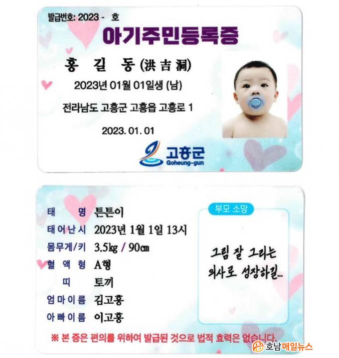¾Æ±âÁֹεî·ÏÁõÀº ÇÃ¶ó½ºÆ½ ÀçÁú·Î Áֹεî·ÏÁõ°ú µ¿ÀÏÇÑ Å©±âÀÌ¸ç ¾Õ¸é¿¡´Â ¾Æ±â À̸§, »ý³â¿ùÀÏ, »çÁø, ÁÖ¼Ò µî ±âº» Á¤º¸°¡, µÞ¸é¿¡´Â Ÿí, ÅÂ¾î³ ½Ã, ¸ö¹«°Ô, Ű, Ç÷¾×Çü, ¶ì, ºÎ¸ðÀ̸§, ºÎ¸ð ¼Ò¸Á µîÀÌ Ç¥±âµÈ´Ù.