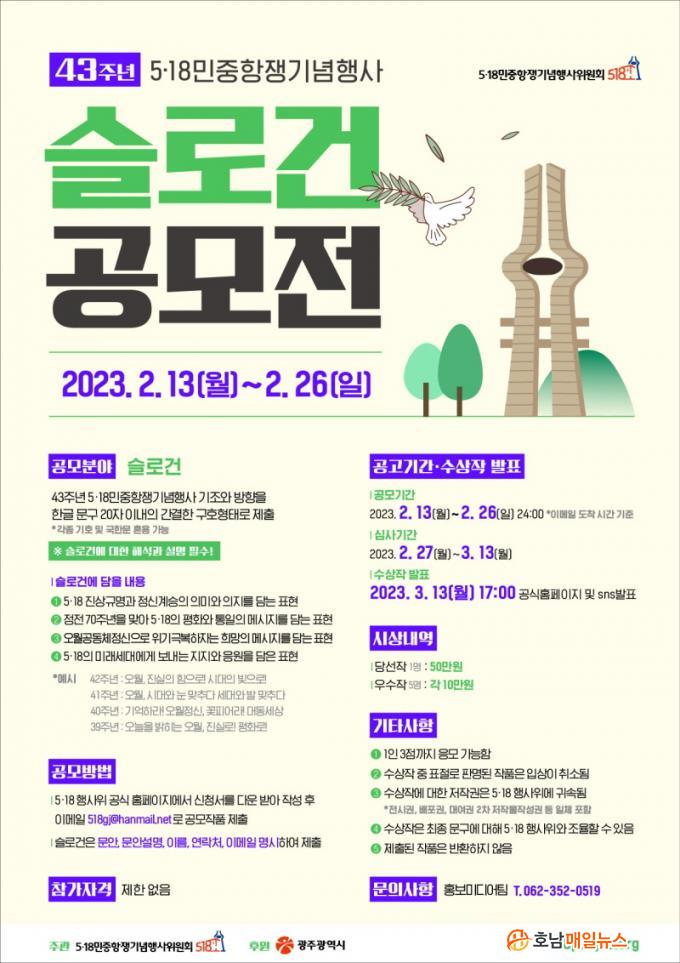 °ø¸ð´Â 1Àδç 3Á¡±îÁö Á¢¼öÇϰí, ¼ö»óÀÛÀº 3¿ù13ÀÏ 5¡¤18Çà»çÀ§ ȨÆäÀÌÁö(www.518people.org) °øÁö °Ô½ÃÆÇ¿¡ °Ô½ÃÇÑ´Ù. ¶ÇÇÑ, Ç¥¾î(½½·Î°Ç)°¡ È®Á¤µÈ ÈÄ 3¿ù14Àϲ² 5¡¤18 ±â³äÇà»çÀÇ ´ëÇ¥ Æ÷½ºÅ͸¦ Àü±¹ °ø¸ðÇÒ ¿¹Á¤ÀÌ´Ù.