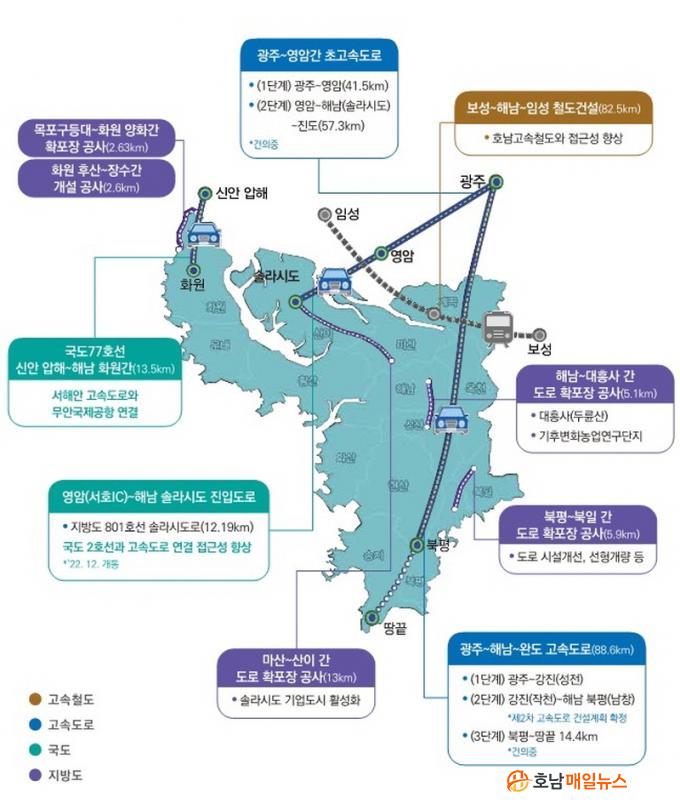 ±¤ÁÖ~³ªÁÖ~¿µ¾Ï~°Áø~ÇØ³²~¿Ïµµ¸¦ ÀÕ´Â °í¼Óµµ·Î »ç¾÷Àº ÃÑ¿¬Àå 88.61Km, 4Â÷¼± °í¼Óµµ·Î¸¦ °Ç¼³Çϱâ À§ÇØ ¾à 3Á¶ 4,000¾ï¿øÀÌ ¼Ò¿äµÇ¸ç, ±¤ÁÖ ¼±¸ º®Áøµ¿~°Áø ¼ºÀü 1´Ü°è(51.11km), °Áø ÀÛõ~ÇØ³² ºÏÆò 2´Ü°è(37.5km)·Î ³ª´©¾î ÃßÁø ÁßÀÌ´Ù.