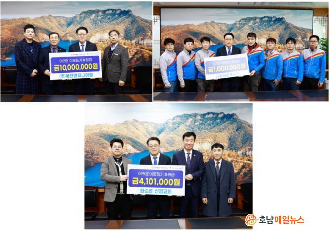 ¸ÕÀú ȼøÀ¾ ½Å±¤±³È¸(¸ñ»ç Á¤Á¾º¹)¿¡¼ ºÒ¿ìÀÌ¿ôµ½±â ¹ÙÀÚȸ ¼öÀÍ±Ý 410¸¸ 1000¿øÀ» ±âŹÇÏ¿´°í, ÀÌ¾î ¢ß¼¼Áø¿£Áö´Ï¾î¸µ(´ëÇ¥ ¹ÚÂù°©) 1,000¸¸ ¿ø, »ç¶û½ÇÀº ºÀ»ç´Ü 100¸¸ ¿øÀ» ±âŹÇß´Ù.