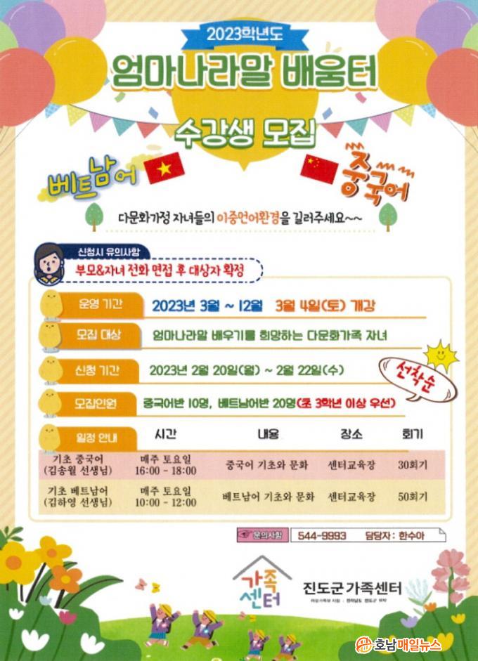¸ðÁý ´ë»óÀº ÃʵîÇб³ 3Çгâ ÀÌ»óÀ¸·Î ¾ö¸¶ ³ª¶ó ¸» ¹è¿ì±â¸¦ Èñ¸ÁÇÏ´Â ´Ù¹®È °¡Á· ÀÚ³à·Î ¿î¿µ ±â°£Àº 3¿ùºÎÅÍ 12¿ù±îÁöÀ̸ç, ¿À´Â 3¿ù 4ÀÏ(Åä) °³°ÇÑ´Ù.¸ðÁýÀοøÀº Áß±¹¾î¹Ý 10¸í, º£Æ®³²¾î¹Ý 20¸íÀ¸·Î ¸ÅÁÖ Åä¿äÀÏ 2½Ã°£À̸ç, ±³À°Àº Áøµµ±º °¡Á·¼¾ÅÍ¿¡¼ ½Ç½ÃµÈ´Ù.