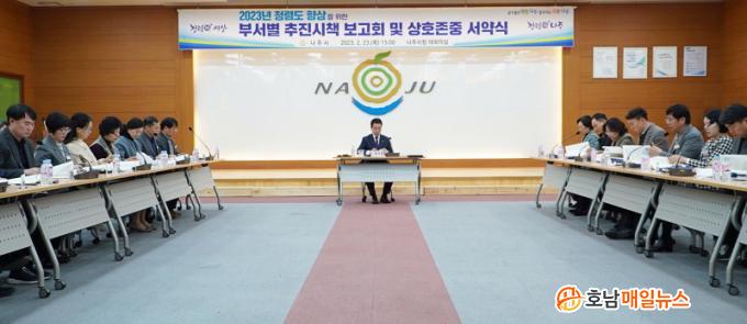 ³ªÁÖ½Ã(½ÃÀå À±º´ÅÂ)´Â ÃÖ±Ù °¿µ±¸ ºÎ½ÃÀå ÁÖÀç·Î Àü ºÎ¼¿¡¼ ¹ß±¼ÇÑ Ã»·Åµµ Çâ»ó ½ÃÃ¥ º¸°íȸ¸¦ °¡Á³´Ù°í 26ÀÏ ¹àÇû´Ù. º¸°íȸ¿Í ÇÔ²² Àü ºÎ¼Àå, À¾¡¤¸é¡¤µ¿Àå 54¸íÀº û·Å ¼¾à½ÄÀ» ÅëÇØ Á¶Á÷ ³» °©Áú ±ÙÀý°ú »óÈ£ Á¸ÁßÀ» ´ÙÁüÇÏ´Â ½Ã°£À» °¡Á³´Ù.