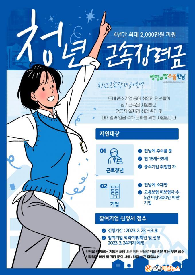 Àü³²¿¡ ÀÖ´Â 5ÀÎ ÀÌ»ó 300ÀÎ ¹Ì¸¸ Áß¼Ò±â¾÷ Áß Àü³²¿¡ ÁÖ¼Ò¸¦ µÐ 18¼¼ ÀÌ»ó 39¼¼ ÀÌÇÏ Ã»³âÀ» °í¿ëÇÑ ±â¾÷ÀÌ ½Åû ´ë»óÀÌ´Ù. °í¿ëº¸Çè ÇǺ¸ÇèÀÚ ¼öÀÇ 30% À̳»¿¡¼ ÃÖ´ë 10¸íÀ» Áö¿øÇÏ¸ç ±â¾÷¿¡´Â 500¸¸ ¿ø, û³â ±Ù·ÎÀÚ¿¡°Ô´Â ÃÖ´ë 1õ500¸¸ ¿øÀ» 4³â°£ ºÐÇÒ Áö¿øÇÑ´Ù.