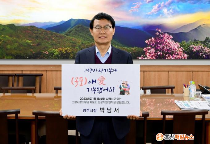 ¹Ú³²¼ ¿µÁÖ½ÃÀåÀº ¡°°íÇâ»ç¶û±âºÎ Ȱ¼ºÈ¿Í ÀڸŰῬµµ½ÃÀÇ ¹ßÀüÀ» ÀÀ¿øÇϱâ À§ÇØ ±âºÎÇÏ°Ô µÆ´Ù¡±¸ç ¡°Àڸŵµ½Ã ¸ñÆ÷ÀÇ ¼º°øÀûÀÎ °íÇâ»ç¶û±âºÎÁ¦ ¾ÈÂøÀ» ±â¿øÇÑ´Ù¡±°í ÀüÇß´Ù.