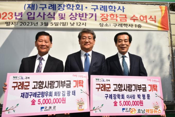 Áö³ 5ÀÏ ¿¸° 2023³â ±¸·ÊÇлç ÀÔ»ç½Ä ¹× »ó¹Ý±â ÀåÇÐ±Ý ¼ö¿©½Ä°ú ÇÔ²² ÁøÇàµÈ °íÇâ»ç¶û±âºÎÁ¦ ±âŹ±Ý Àü´Þ½Ä¿¡¼ ±è±¤Å ȸÀå°ú ¹ÚÇü¹® ÀÌ»çÀåÀº °¢ 500¸¸ ¿ø¾¿À» ±¸·Ê±º¿¡ ±âŹÇÏ¿´´Ù.