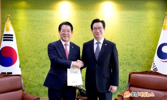 °£´ãȸ¿¡´Â ±ÇÀçÇÑ ³ó½ÄǰºÎ ³ó¾÷Çõ½ÅÁ¤Ã¥½ÇÀå, °È¿¼® Àü³²µµ ³óÃà»ê½Äǰ±¹Àå µîÀÌ ÇÔ²² Âü¼®Çß´Ù. ±è¿µ·Ï Áö»ç´Â ÀÌ ÀÚ¸®¿¡¼ ¡°ÀÌÁ¦ ´ëÇѹα¹ ³ó¾÷µµ ÷´Ü³ó»ê¾÷ ±â¼ú(¾Ö±×Å×Å©)À» ±â¹ÝÀ¸·Î ÇÏ´Â µðÁöÅÐ ³ó¾÷°ú ¼öÃâ Áß½ÉÀ¸·Î ´ëÀüȯÀÌ ÇÊ¿äÇÏ´Ù¡±¸ç ¡°À̸¦ ½ÇÇöÇϱâ À§ÇØ Àü³²ÀÌ ÃßÁøÇÏ´Â ÀΰøÁö´É ÷´Ü ³ó»ê¾÷À¶º¹ÇÕÁö±¸ Á¶¼º ¹× ±¹Á¦À¯±â³ó½Äǰ ¼öÃâÇ÷§Æû ±¸Ãà»ç¾÷ µî¿¡ ÀüÆøÀû Áö¿øÀ» ¹Ù¶õ´Ù¡±°í ¿äûÇß´Ù.
