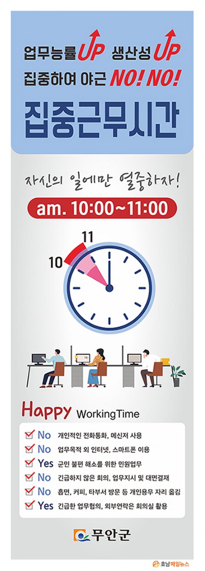 ¹«¾È±ºÀº Àϰú ½Ã°£ Áß ¿ÀÀü 10½ÃºÎÅÍ 11½Ã±îÁö¸¦ ÁýÁß±Ù¹« ½Ã°£À¸·Î Á¤Çϰí ÀÌ ½Ã°£ µ¿¾È¿¡´Â ºÒÇÊ¿äÇÑ È¸ÀÇ, Ÿ ºÎ¼ ¹æ¹®, °³ÀÎÀûÀÎ ÀüÈ, ÀÎÅÍ³Ý µî »çÀûÀÎ ¿ë¹«¿Í ÈÞ½ÄÀ» À§ÇÑ À̼®À» ÀÚÁ¦ÇÏ¿© ÁýÁß±Ù¹«Á¦ ¿î¿µ¹æ¾ÈÀ» ¸¶·ÃÇÒ °èȹÀÌ´Ù. ´Ù¸¸, ÁýÁß±Ù¹« ½Ã°£ÀÌ¶óµµ ¹Î¿ø ó¸®¿Í ±ä±ÞÇÑ ¾÷¹«ÇùÀÇ µîÀº Æò¼Òó·³ ó¸®ÇØ ºÒÆíÀÌ ¹ß»ýÇÏÁö ¾Êµµ·Ï ¿î¿µÇÒ ¹æÄ§ÀÌ´Ù.