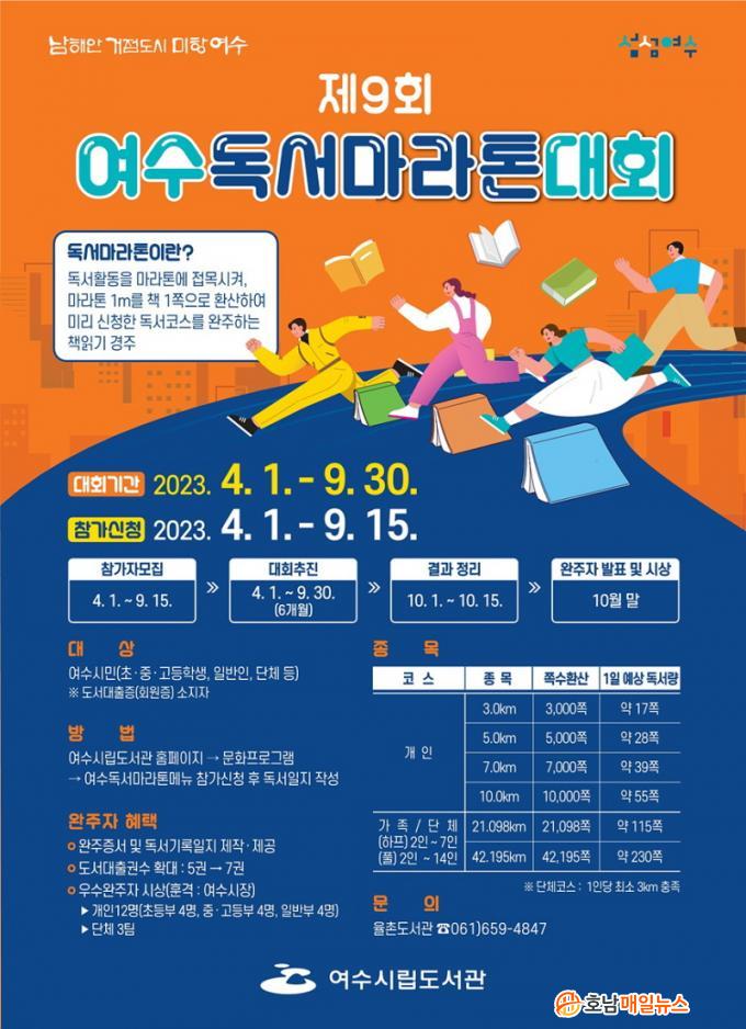 ½ÅûÀº 4¿ù 1ÀϺÎÅÍ 9¿ù 15ÀϱîÁö ¿©¼öµ¶¼¸¶¶óÅæ´ëȸ ȨÆäÀÌÁö(yslib.yeosu.go.kr/marathon/lib/)¿¡¼ ÇÒ ¼ö ÀÖÀ¸¸ç, Âü°¡ ½Åû ÈÄ µ¿ÀÏ È¨ÆäÀÌÁö¿¡¼ µ¶¼±â·ÏÀÏÁö¸¦ ÀÛ¼ºÇÏ¸é µÈ´Ù.¿ÏÁÖÀÚ¿¡°Ô´Â ¿ÏÁÖÁõ¼ ¼ö¿©, µ¶¼±â·ÏÀÏÁö Áö±Þ, µµ¼ ´ëÃâ±Ç¼ö È®´ë(5±Ç¡æ7±Ç) µî ´Ù¾çÇÑ ÇýÅÃÀÌ ºÎ¿©µÈ´Ù.