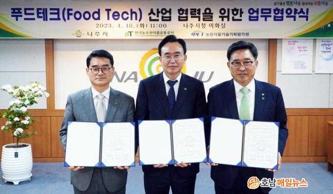 ³ªÁÖ½Ã(½ÃÀå À±º´ÅÂ)´Â 18ÀÏ ½Ãû»ç ÀÌȽǿ¡¼ ºû°¡¶÷ Çõ½Åµµ½Ã ÀÌÀü°ø°ø±â°üÀÎ Çѱ¹³ó¼ö»ê½ÄǰÀ¯Åë°ø»çaT(»çÀå ±èÃáÁø), ³ó¸²½Äǰ±â¼ú±âȹÆò°¡¿ø(¿øÀå ³ë¼öÇö)°ú ¡®ÇªµåÅ×Å© »ê¾÷ Çù·ÂÀ» À§ÇÑ ¾÷¹«Çù¾à¡¯À» ü°áÇß´Ù°í ¹àÇû´Ù.