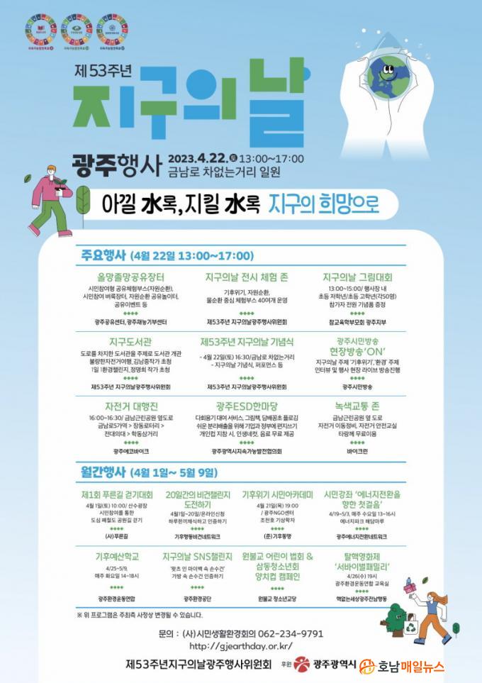 ¡®Áö±¸ÀÇ ³¯¡¯ ±â³ä½ÄÀº 55°³ ±â°ü¡¤´Üü°¡ Âü¿©ÇÑ Á¦53ÁÖ³âÁö±¸Àdz¯±¤ÁÖÇà»çÀ§¿øÈ¸ ÁÖ°üÀ¸·Î ¿ÀÈÄ 4½Ã30ºÐ YMCA¾Õ ¹«´ë¿¡¼ ¡®¾Æ³¥â©·Ï, ÁöÅ³â©·Ï Áö±¸ÀÇ Èñ¸ÁÀ¸·Î¡¯¸¦ ÁÖÁ¦·Î ¿¸°´Ù.