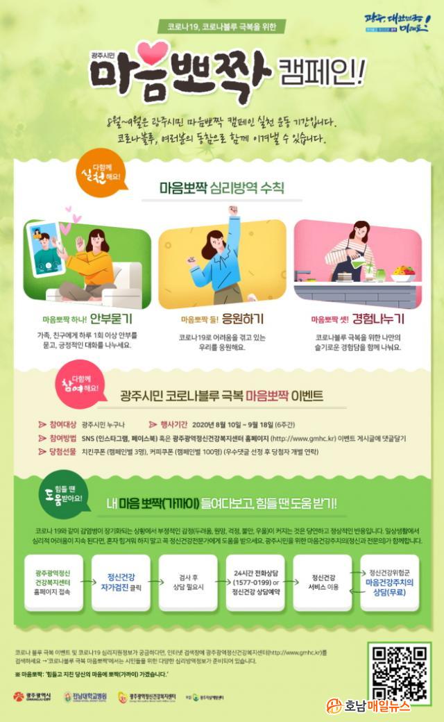 ±¤Áֽô ¡®¸¶À½»Ç¦¡¯ ½Çõ Ä·ÆäÀο¡ ´ëÇÑ ½Ã¹ÎµéÀÇ Àû±ØÀûÀÎ Âü¿©¸¦ À¯µµÇϱâ À§ÇØ ¿À´Â 9¿ù18ÀϱîÁö ¿Â¶óÀÎ À̺¥Æ®µµ ½Ç½ÃÇÑ´Ù. À̺¥Æ® Âü¿©´Â ±¤ÁÖ±¤¿ªÁ¤½Å°Ç°º¹Áö¼¾ÅÍ È¨ÆäÀÌÁö³ª ¼Ò¼È³×Æ®¿öÅ©½Ã½ºÅÛ(SNS¡¤ÀνºÅ¸±×·¥, ÆäÀ̽ººÏ)¿¡ ¡®¸¶À½»Ç¦¡¯ ¼öÄ¢¿¡ ÇØ´çÇÏ´Â ³»¿ëÀ» ´ñ±Û´Þ±âÇÏ¸é µÇ¸ç, Ãß÷À» ÅëÇØ ÃÑ 303¸í¿¡°Ô ¼ÒÁ¤ÀÇ ¸ð¹ÙÀÏ ÄíÆùÀ» Áö±ÞÇÑ´Ù.